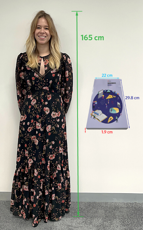 Show students video 2. The video shows that Rebecca is 165 cm tall. The length x width x height of the book is 29.8 x 22 cm x 1.9 cm.